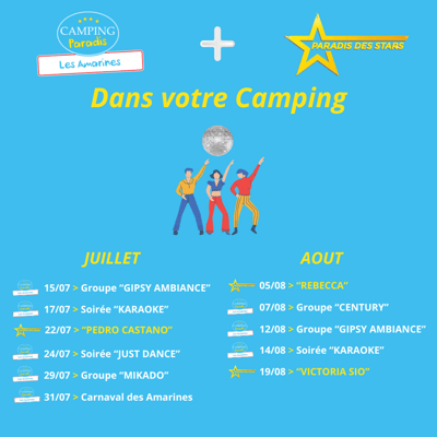 Du 15 juillet au 19 août, tous les mardis et jeudis, dans votre Campings Paradis, des concerts, spectacles et animations réalisés par des artistes. Petit plus avec le Paradis des